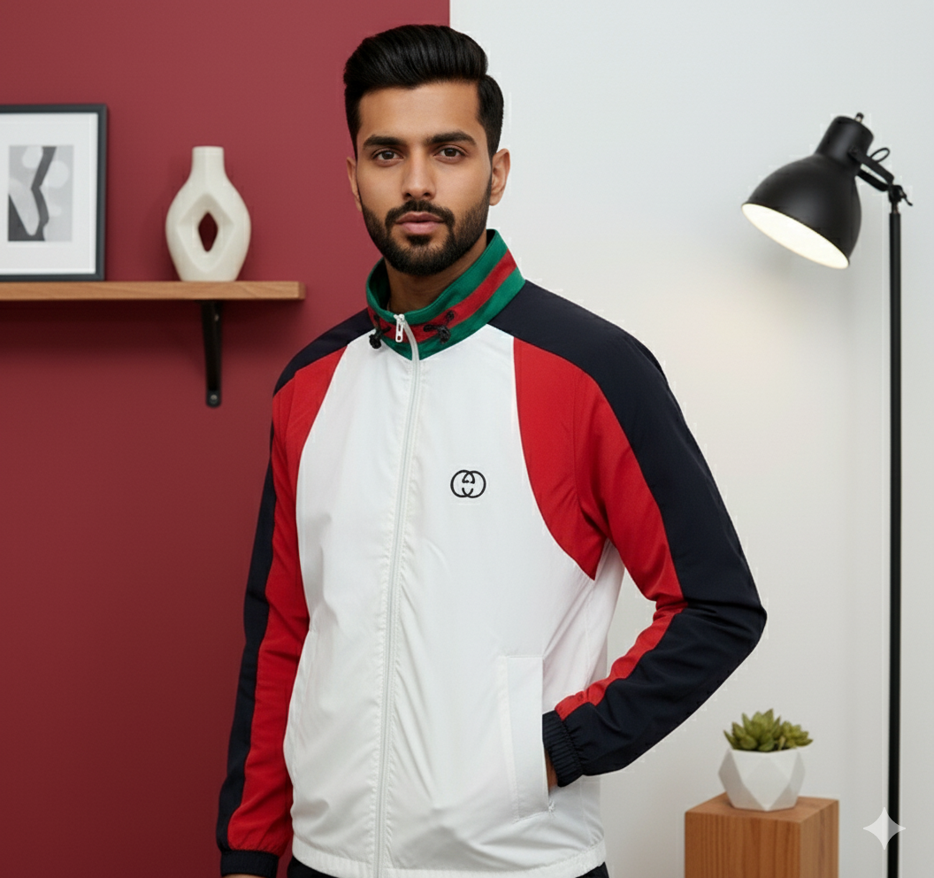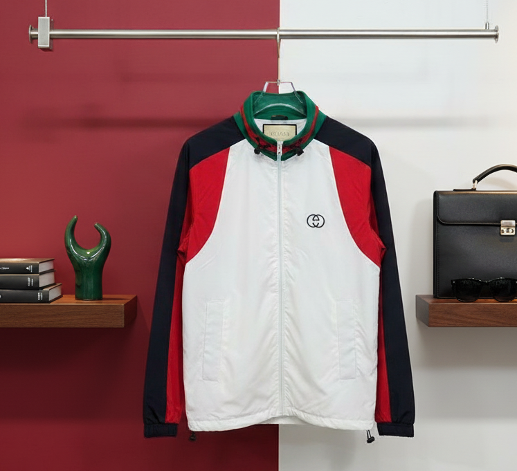 Make a bold statement with this iconic track jacket, featuring a vibrant color-block design that seamlessly blends classic athletic aesthetics with high-fashion detailing. This jacket is characterized by its crisp white body, contrasted with striking red and black panels on the shoulders and sleeves, creating a dynamic visual appeal. The standout feature is the ribbed collar, adorned with the signature green and red stripe, instantly recognizable and adding a touch of sophisticated flair. Crafted for comfort and style, this piece is perfect for an elevated casual look.