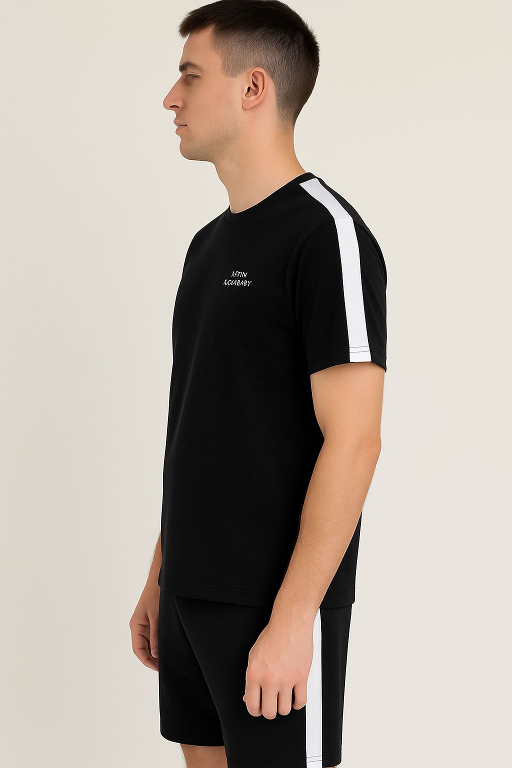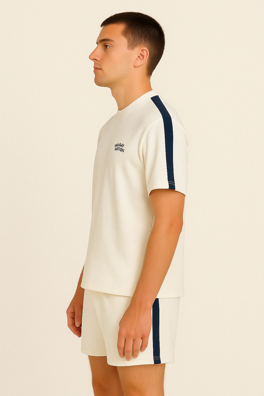 Product Description Elevate your casual wardrobe with this chic off-white co-ord set, featuring a clean and modern design with subtle luxury accents. The short-sleeve crewneck T-shirt is detailed with bold black lettering on the chest reading "MARQUE L'VUITTON DEPOSEE" for a designer-inspired edge. Contrasting black stripe panels run along the shoulders and sleeves, perfectly mirrored on the matching shorts for a cohesive, streamlined look. Product Details Premium soft-touch off-white fabric for all-day comfort Short-sleeve crewneck T-shirt with bold black designer-style chest text Contrasting black stripe detailing on shoulders, sleeves, and shorts’ side seams Matching elastic waistband shorts for a secure and relaxed fit Minimalist yet statement-making style for versatile wear Perfect for streetwear, lounge, or travel fashion