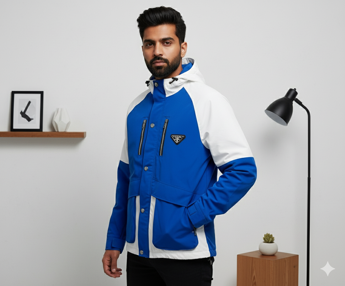 • Design: Color-block style with a prominent blue body and white accents on the shoulders, sleeves, and front pockets.