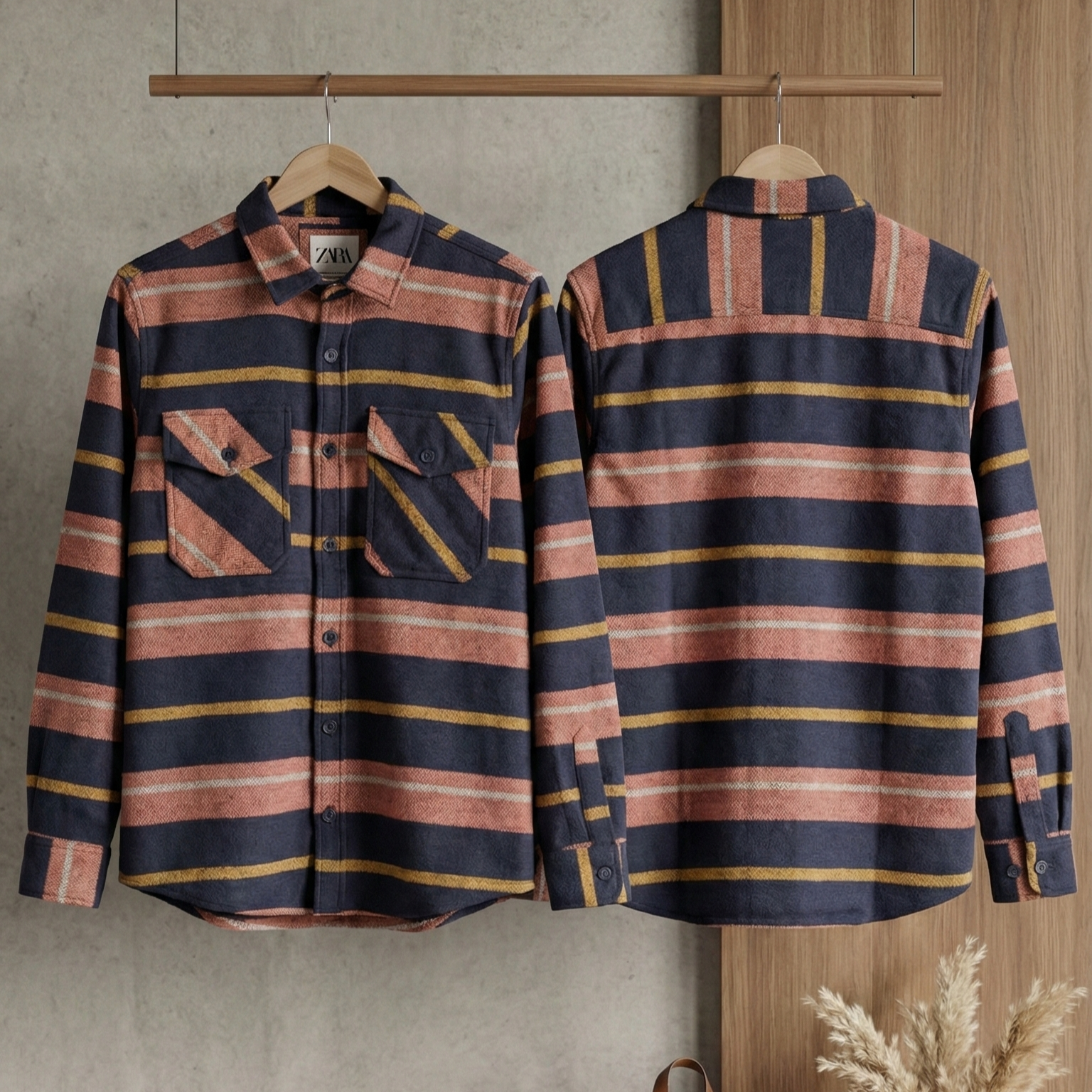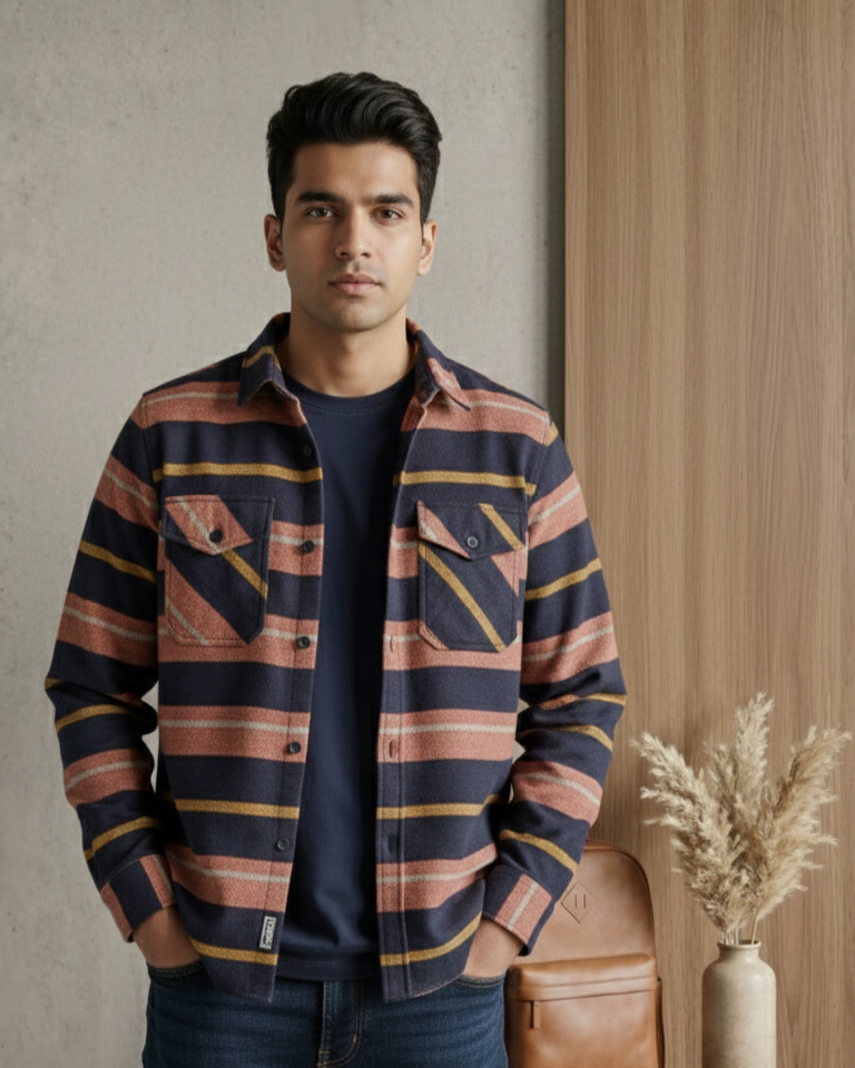 • The Navy Stripe: A bold, retro-inspired flannel featuring horizontal block stripes in deep navy, dusty rose, and mustard yellow.